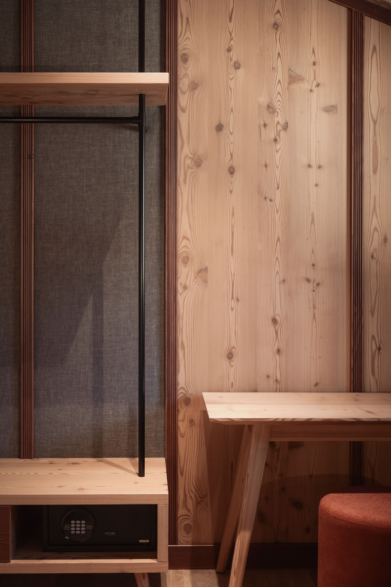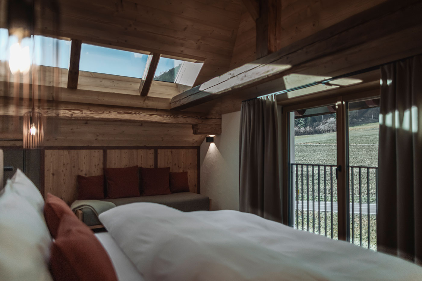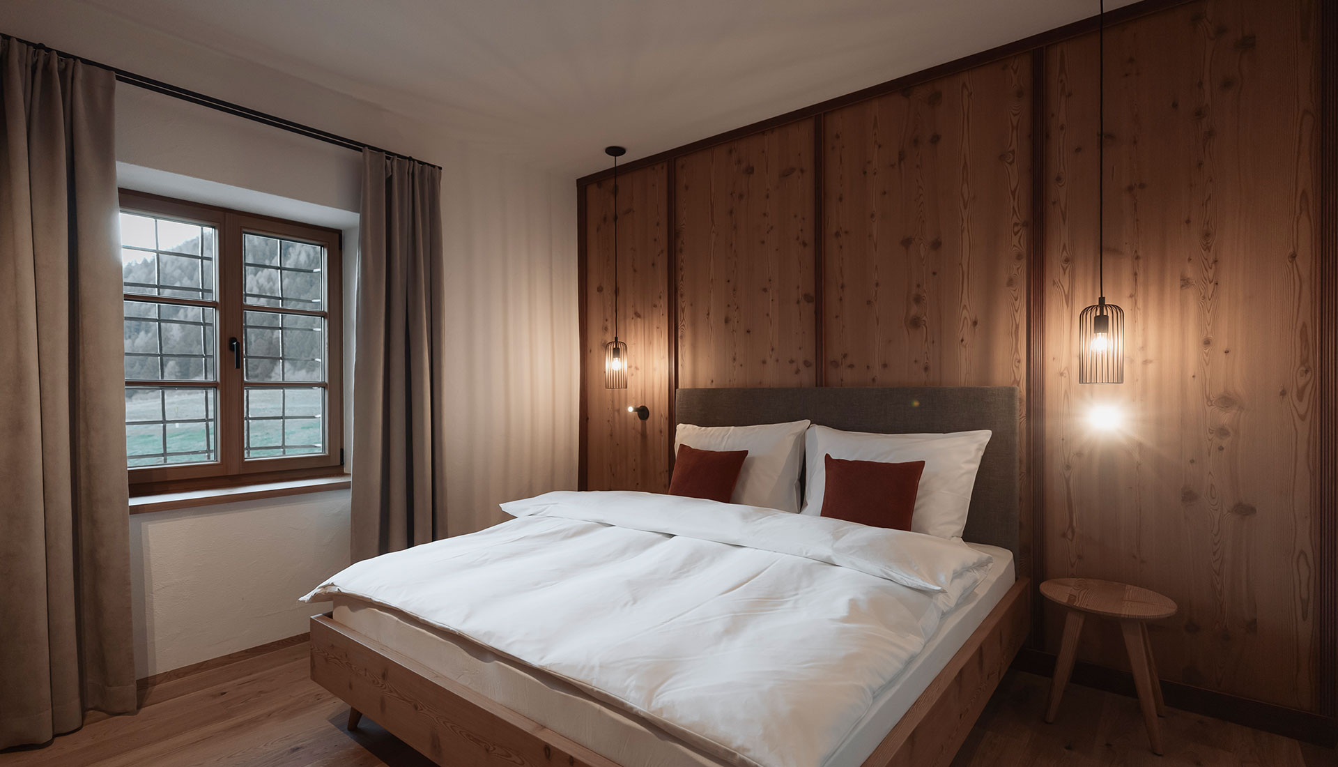 - Schlafzimmer: Doppelzimmer mit modern interpretierter Lärchen-Holztäfelung, Sofa, Schreibtisch und großem Panoramafenster mit Blick ins Grüne