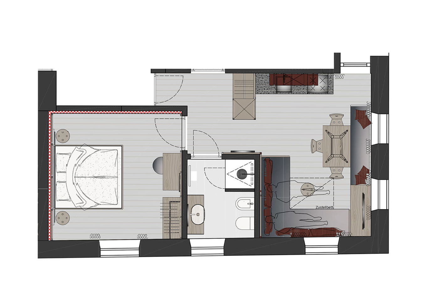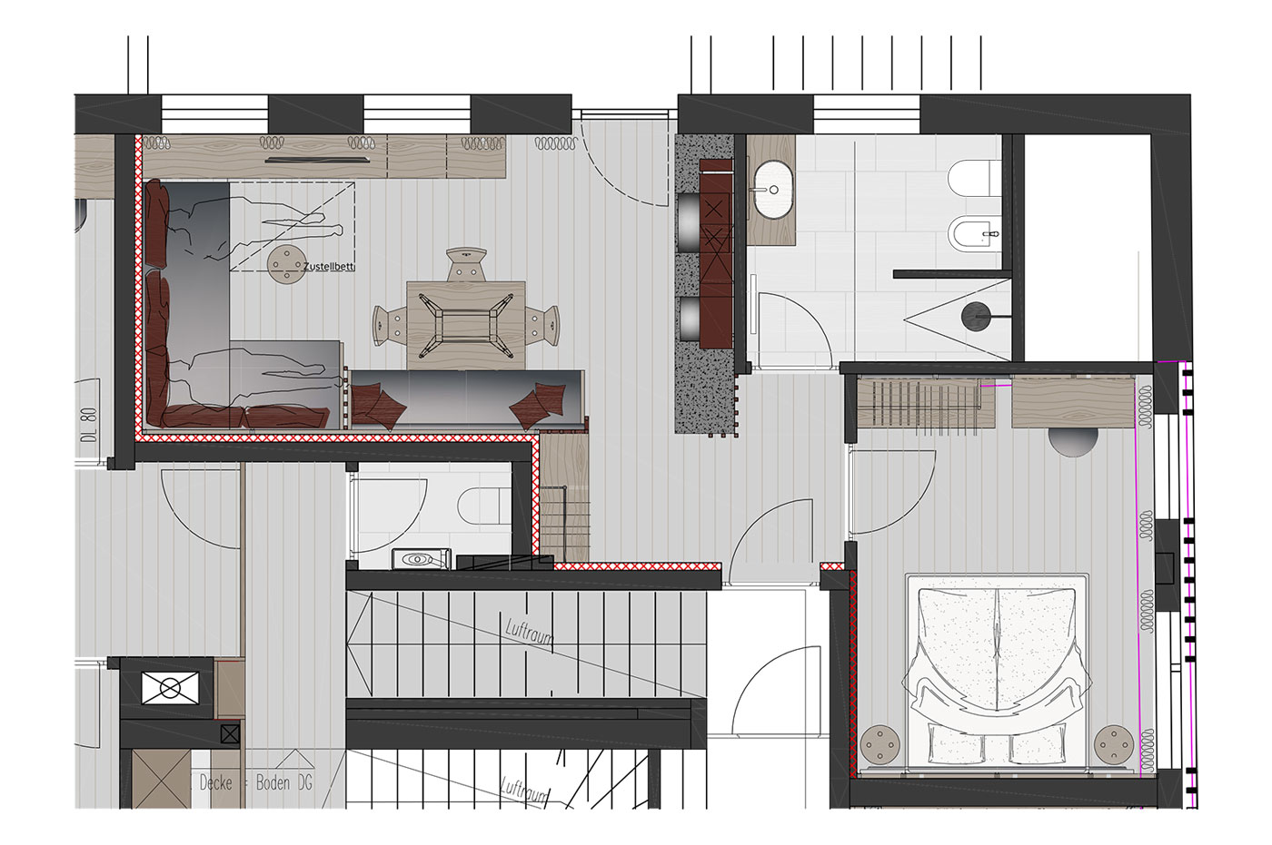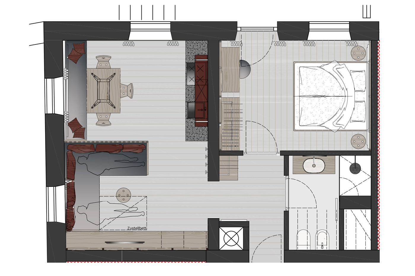 Das gemütliche Loft im Dachgeschoss lässt sich über eine Treppe vom Apartment Natura aus erweitern – 23 m² zusätzlicher Raum für mehr Platz, Rückzug und Flexibilität.